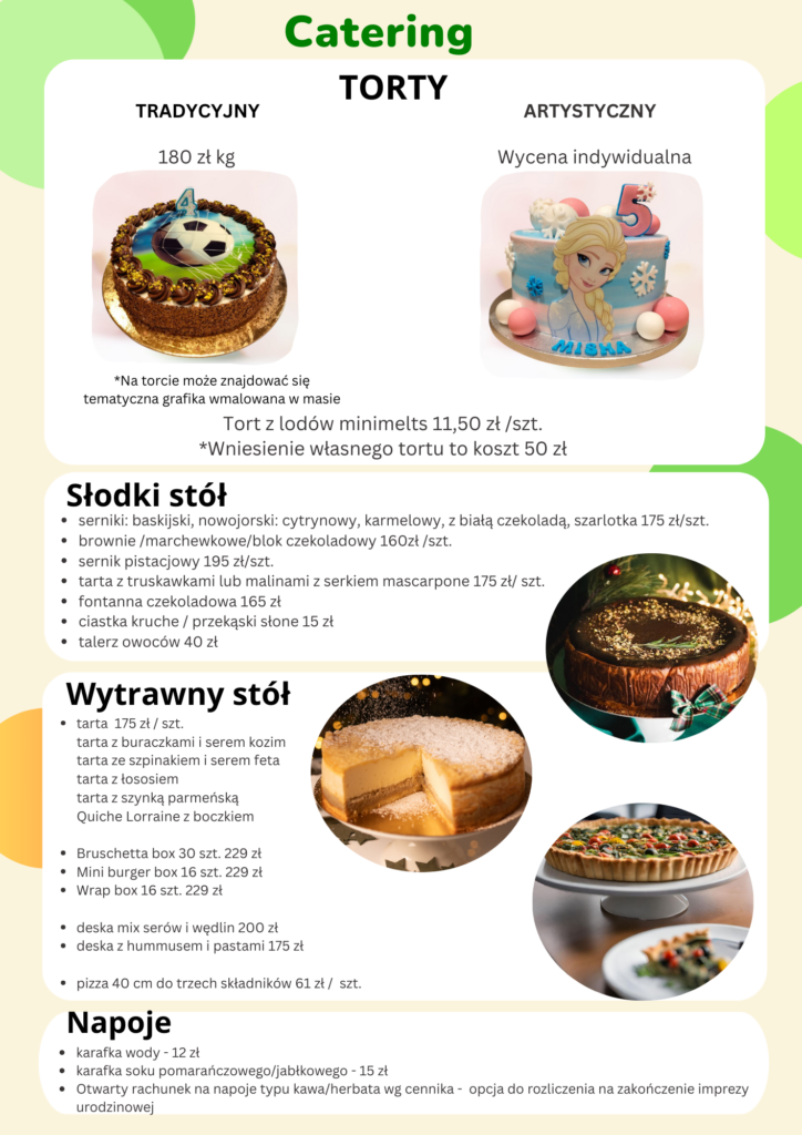Menu na urodzinki dla Dzieci przygotowaliśmy przede wszystkim z myślą o dobrej zabawie i bezpieczeństwie Dzieci. W związku z tym tak dobraliśmy menu, aby podane przekąski były delikatne, łatwe do zjedzenia nawet wtedy, gdy Dzieci są pełne wrażeń i emocji. 🙂 Na stołach czekają patery z ciastkami, popcorn, paluszki, chrupki kukurydziane, w pakiecie wyjątkowym – także lody Minimelts. Nielimitowana woda niegazowana, sok do 0.5 l na Dziecko. Jest możliwość zabrania ze sobą pozostających w stole przekąsek – prosimy zabrać pojemniki. Dodatkowe opcje na życzenie – pizza, suszone lub świeże owoce, zupy, kanapki, catering – do uzgodnienia.