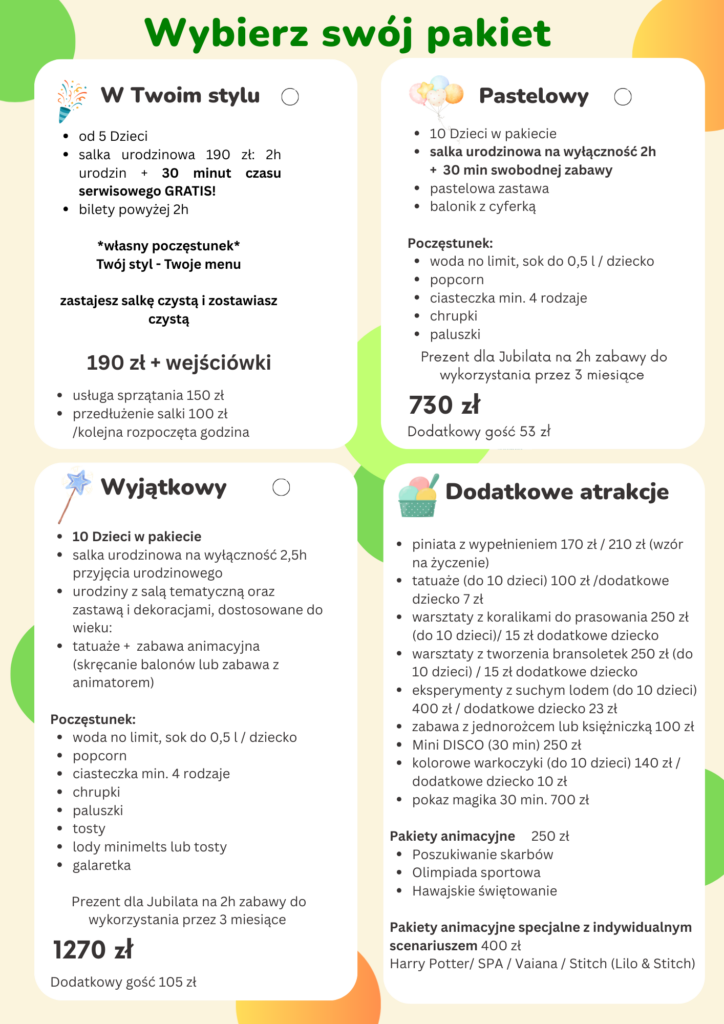 Pakiety Urodzinkowe – Cennik na urodziny dla Dzieci